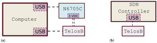 Connection diagrams for (a) energy consumption measurement using the N6705C of Keysight and (b) the SDN controller and TelosB gateway.