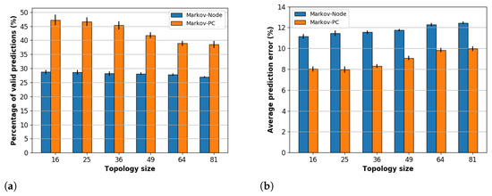 Figure 4a depicts the percentage of valid predictions and Figure 4b depicts the average prediction error metric. The Markov-PC scheme obtained the highest percentage of valid predictions and the lowest prediction error, which means it is the most effective to reduce energy packets updates. Moreover, we observed that the topology size has more impact on the Markov-PC scheme than on the Markov-Node scheme. In terms of percentage of valid predictions, the average results in the Markov-scheme decrease , from 16 nodes to 81 nodes, while for the Markov-Node scheme the decrease is .