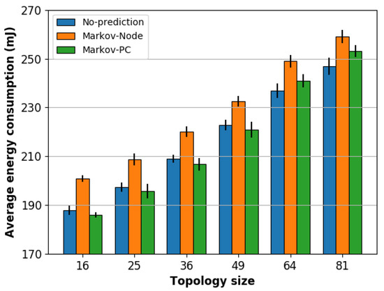 Figure 5 depicts the average energy consumption including the scenario without prediction. Comparing both Markov chain schemes with the No-Prediction scheme, the Markov-PC scheme reduces the average energy consumption of the networks with sizes from 16 to 49 nodes, whereas the Markov-Node scheme increases the average energy consumption for all sizes. This means that the Markov-Node scheme energy consumption trade-off is not positive: it spends more energy than the amount it is able to save. On the other hand, the Markov-PC scheme, the one with the better prediction performance, saves approximately 1% of energy consumption in the topologies between 16 and 49 nodes but increases this metric 1% for 64 nodes and 5% for 81 nodes. If we go back to the percentage of valid predictions in Figure 4a and compare those results with the energy consumption results for Markov-PC scheme, we can say that it is necessary over 40% of valid predictions to save energy.