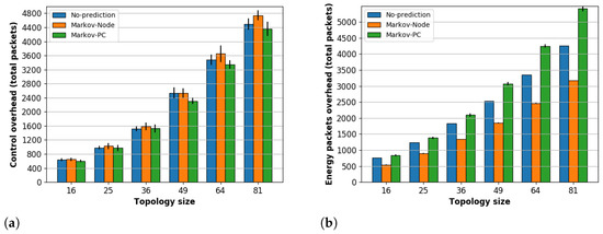 Figure 6a,b depicts the control and energy packets overhead, respectively. Regarding control packets overhead, the results show similar values for all the schemes in topologies from 16 to 36 nodes. This means that the prediction schemes implementation do not increase the control overhead for small networks. Moreover, we observed that the Markov-PC reduces the control overhead in around and for 49, 64, and 81 nodes. On the other hand, the Markov-Node scheme increases the control overhead between and for topologies with 64 and 81 nodes. This increase is related to the control packets delivery rate, which is analyzed further below.
