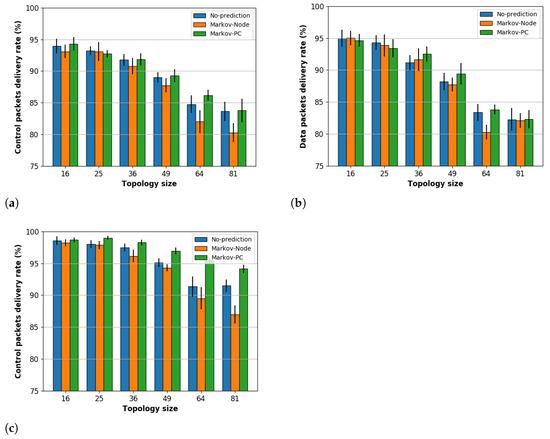 Figure 7a–c depicts the delivery rate for control, data, and energy packets, respectively. From those figures, we observed that the Markov-PC scheme equals or improves the delivery rate with respect to the No-Prediction scheme results. For example, in the case of the energy packets delivery rate, the result for the Markov-PC are between and over the No-Predictions scheme.