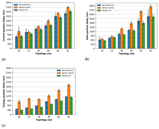 Figure 8a–c depicts the average delay for control, data, and energy packets, respectively. The first we observed is that the Markov-Node scheme obtained the highest delay in all the packet types, with a significant difference in the energy packet. In this case, the delay is from to higher than the delay in the No-Prediction scheme. Unlike the Markov-Node scheme, the Markov-PC scheme was able to maintain the control and data packets delay with respect to the No-Prediction scheme, but also it was able to reduce the delay up to in the case of the energy packets.