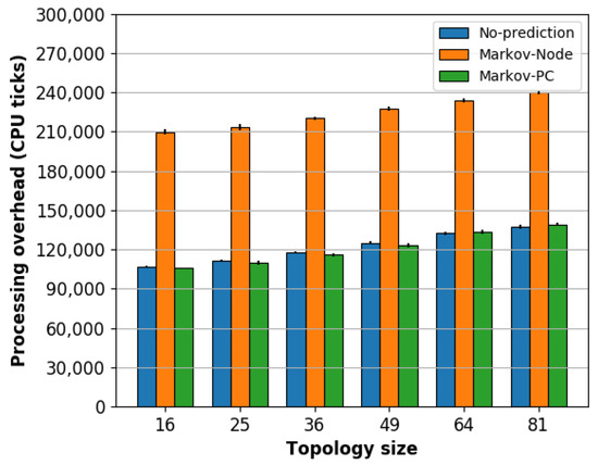 The increase in the delay using the Markov-Node scheme is caused by its processing overhead. As shown in Figure 9, the Markov-Node scheme doubles the processing overhead of the Markov-PC and No-Prediction schemes. This processing overhead delays energy packets forwarding. Furthermore, as energy and data updates have the same period, it also delays data packets forwarding. The Markov-PC and No-Prediction schemes have similar processing overheads. Thus, recalling the overhead and delivery rate results, despite the fact that the Markov-Node scheme reduces the number of energy packets in the network, the high delay caused by processing overhead could be affecting both energy packets and data packets delivery rate.