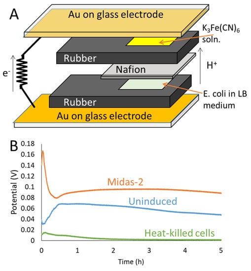 Two types of MFCs were used in these experiments. The µL-MFCs were constructed according to literature designs with some modifications [48]. Gold-coated glass slides were used for both the anode and cathode (active areas of 0.4 cm2) with a Nafion 117 separator, and butyl rubber (0.3 cm thick) was used to create anode and cathode compartments with volumes of 120 µL; the Nafion separator keeps bacteria out of the cathode compartment while allowing redox mediators to move across the barrier. In the anode compartment, cultures with an OD600 of 0.9–1.2 were added, while in the cathode compartment, 100 mM potassium ferricyanide (Sigma-Aldrich) was used as the electron acceptor. U-tube MFCs were also constructed based upon previously reported protocols [28,49]. Twenty mL of LB was used in each of the anode and cathode chambers. Again a Nafion 117 separator was used. At the cathode, a carbon felt electrode was placed partially submerged in the cathode chamber; this allows liquid to wick up the felt. In the wicking region, liquid air and electrode are all in close proximity, allowing oxygen to be used as the electron acceptor [49]. The chambers were autoclaved with the carbon felt cathodes, Nafion separators, LB media and gold anodes in place. Cultures were diluted into the anode compartment to achieve an initial OD600 of 0.005.