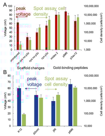 For the eCPX scaffold variations examined here, Figure 3A shows the peak voltage on the left axis (red bars) and the binding affinity on the right axis (green bars). The uninduced cells, which do not display the eCPX scaffold, have an average peak voltage of 62 mV while having a low affinity to gold. With the 1 MΩ resistance and an active area of 0.4 cm2, this corresponds to a power of approximately 0.1 mW/m2, similar to the performance of E. coli and other electrogenic organisms in similar setups [48,54,55].