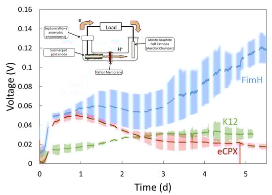 Voltage in U-tube microbial fuel cells (schematically shown inset) held at 1 MΩ and inoculated with cells displaying either the p8#9 peptide on other the eCPX or FimH scaffold, or lacking either scaffold altogether (labeled K12). The shaded regions show one standard error away from the average calculated from multiple runs (n = 3 FimH, n = 2 K12, eCPX). Cells displaying eCPX and FimH outperform the K12 cells within the first day and the FimH scaffold cells continue to produce higher voltages throughout the experiment.
