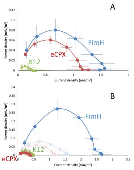 Variable resistance data at 1 day (A) and 5 days (B) for the same runs as shown in Figure 4. The 1 day data is shown grayed (faded?) out in B for comparison. At 1 day, cells displaying p8#9 in the FimH and eCPX have similar power and current densities, which are 3–5 times higher than the power densities achieved with the K12 control. At 5 days the power density with the FimH scaffold and with the K12 control have increased by a factor of 3, while the power density with the eCPX scaffold has declined. The error bars show 1 standard deviation away from the mean.