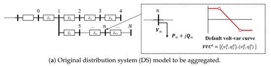 A part of the radial DS to be aggregated is shown in Figure 1a. Let be the time in simulation where T is the total simulation time, and be the index of the bus to be aggregated where N is the total number of them. Sequences of active power, reactive power, and voltage at bus n are represented by , , and . Generally, the bus voltage can be calculated by the QSTS simulation when the active power and reactive power are given. The active power and reactive power can be divided into a passive part and active part, respectively, as follows: