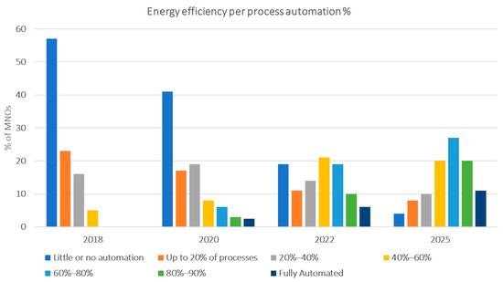 The presented points are also summarised, through process automation percentage, in Figure 2. These projects are derived from the ITU-T technical report [53], and showcase the exponential impact of process automation and AI in the 5G wireless network energy consumption.