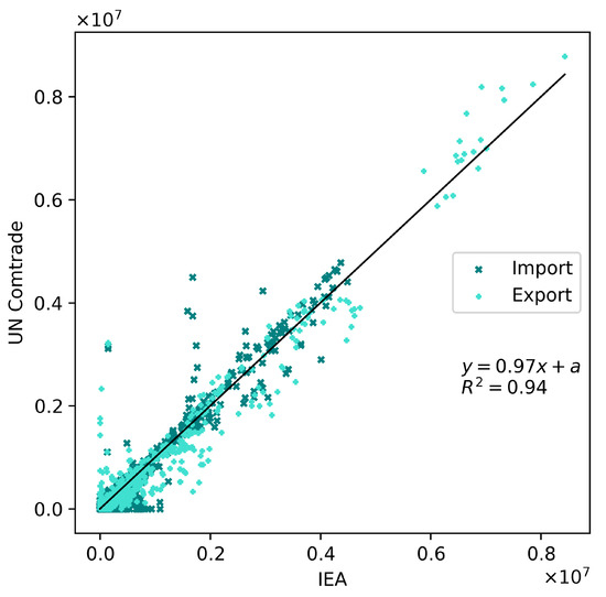 With access to the two databases, we have an opportunity to fill in the gaps in data, detect erroneous data, perform a general verification, and comprise a more comprehensive database. The majority of data categories can be found in both databases; however, the UNCT database contains more comprehensive bilateral trade information, whereas IEA has more granular data on produced and consumed energy [32]. To combine the data extracts and expand our dataset, in support of a more granular analysis, we checked the data for consistency.