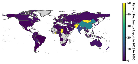 The ratio of net energy exports in 2018 to 2000 (below) based on UNCT database.