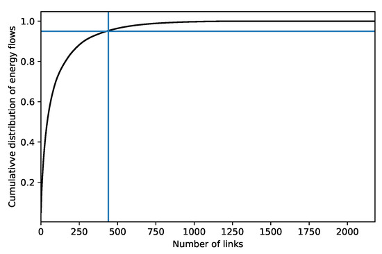 We analyze the evolution of trade connections by examining the dynamics in the number of links, namely looking at changes in individual economy degrees and the global degree distributions. Figure 4 provides an example of the cumulative distribution reporting the number of links associated with a given percent of the total energy traded. The distribution reveals that, in 2018, 95% of the total energy traded has been supplied by 22%, or 490 out of 2180, links. The trade links are arranged by the trade volume, with the smallest contributor standing last, depicting the concentration of flows. In what follows, we focus on the essential links falling into the 95th percentile, reducing the size of the network. Such a link cut-off is applied to each fuel separately and recalculated for every year.
