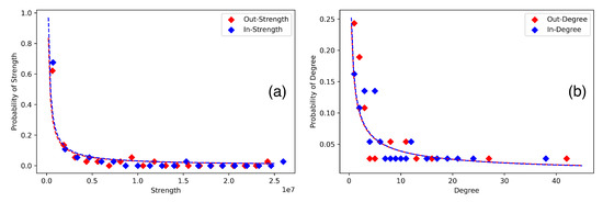The strength (a) and degree (b) distributions for fossil fuels energy trade in 2018.