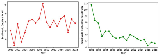 The evolution of small-world coefficient for oil (left) and the INEF (right).