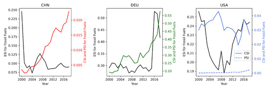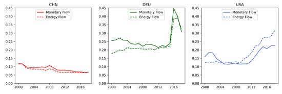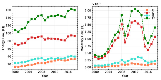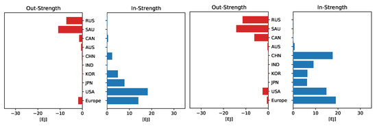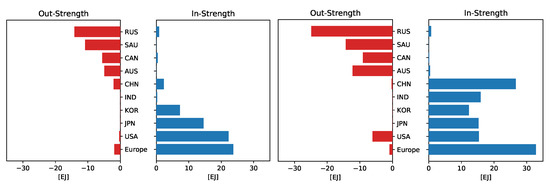 The change in energy generation and utilization technologies makes a dynamic variable whose value may change across the economies. Without loss of generality, we leave the technical details outside the scope of our paper and, in what follows, assume perfect substitutability, i.e., for ∀. In this case, and the flow of fossil fuels between any two economies i and j is equal to the sum of net flows of coal, natural gas, and oil, and Equation (10) is rewritten as: