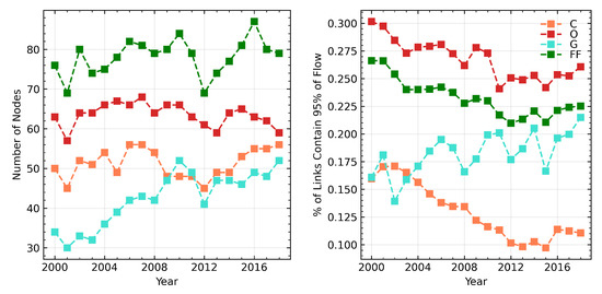The evolution of networks characteristics (number of nodes and number of links) for coal (C), oil (O), natural gas (G), and fossil fuels ().