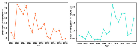 The network is said to possess the small-world property if the coefficient [35]. Despite its sensitivity to network size, serves as a helpful measure showing the changes in the network connectivity. In reality, the small-world feature is often associated with networks consisting of several interconnected communities. The increase in the number of links or closer integration often results in higher or strengthening of the small-worldness. However, if the location of the new links does not shorten the average distance and/or coincides with the disappearance of links and decreasing clustering, the small-worldness may be weakened. Figure 6 demonstrates how the INEF has experienced a reduction in the small-worldness. To develop further understanding of the drivers behind the small-world measure reduction, in Section 5, we provide the clustering coefficients and the average shortest path lengths estimates for individual fuel networks.