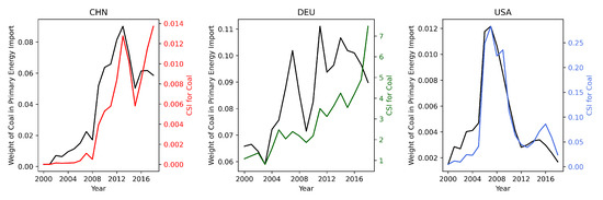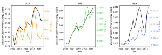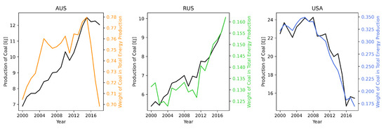 Here, is the primary energy consumption of fuel k, whereas is the total primary energy supply in economy i. ESI has been designed to measure energy security from an importer perspective and does not provide an appropriate measure for energy export risk exposure. Changing weather conditions, global crises, and fuel preferences make exporting economies face acute supply risks and speak of supply security. Thus, the COVID-19 pandemic has resulted in a sharp drop in oil use, having a detrimental effect on the oil exporters. Besides, economy-specific import constraints are a commonly used instrument for political and economic pressure [39]. Among the most well-known examples are financial and trade sanctions on Iran that were imposed starting in 1970, reintroduced by the U.S., and the E.U. several times. Iran suffered from the curtailed export, forced to search for new buyers for its oil and develop new supply routes [40]. Under the energy transition, some exporters become especially vulnerable, facing changing fuel preferences and shrinking supply opportunities. The carbon neutrality targets adopted by the increasing number of economies suggest changes in the future coal production and trade possibilities, calling for coal export security analysis.
