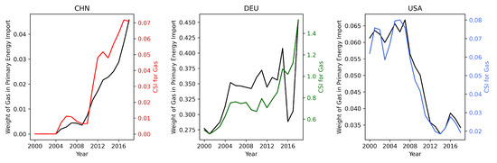 While the diversity of the fast-growing body of literature addresses the expanding number of relevant questions, several drawbacks call for further contributions. First, the revealed dynamics in the trade and security of supply suggests that the analysis should be regularly updated [7]. Second, the network models often separate energy and monetary flows, raising the question of how to compare them [16,17,18,19]. Third, with a few exceptions, analyses focus on one particular fuel (e.g., natural gas [20], coal, or oil) or combine all energy sources together. Such approaches prevent researchers from understanding the role of individual fuels and the importance of their substitutability, which plays a key role in the energy transition [21]. Finally, numerous studies on energy security, offering a wide range of security indexes and comparisons of them, traditionally limit their attention to one or two of the following aspects: (1) supply diversification, thus rarely considering the security or vulnerability of exporters; (2) one selected fuel or all fuels without insights about individual fuel contributions; and (3) individual energy-system component changes, namely interfuel substitution, or a change in the domestic demand or supply level [22,23]. However, understanding trade-offs among various energy-security components is essential in the time of the energy transition and developments of new production possibilities [24,25,26]. The study on the global security index study concludes that various measures are required to understand energy security, as countries vary in their capabilities, priorities, expectations, and preferences [27].