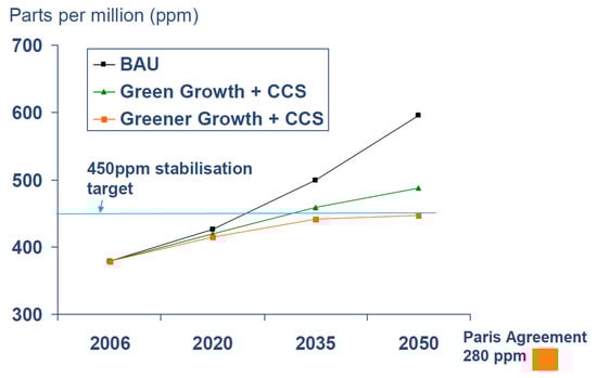 Today any civilized action has a carbon footprint. To reduce the global warming rate, the legally binding Paris Agreement was signed by the World Leaders in December 2015, with the primary objective to keep the global temperature rise below 2 °C compared to pre-industrial levels until 2100. A further ambition is 1.5 °C []. However, Figure 1 indicates that these goals will not be achieved. According to the OECD Outlook Baseline Projects Report, without more ambitious policies yet to be developed, the greenhouse gas emissions (GHG) would reach almost 685 parts per million (ppm) CO2-equivalents by 2050. This concentration is well over the limit of 450 ppm (parts per million) to have at least a 50% chance of meeting the Paris Agreement goals [].