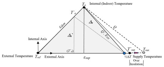 In Figure 2, with the application of over insulation to the building, the supply exergy, εsup, and the triangle area decrease, which means that ψR also decreases. According to Equation (A9), any decrease in εsup reduces ΔCO2, but at the same time, any decrease in ψR, according to Equation (A9), increases ΔCO2. A small decrease in Ta may offset this increase if indoor comfort requirements permit. At any rate, this discussion shows that it is also possible to determine an optimum over insulation by using Figure 2.