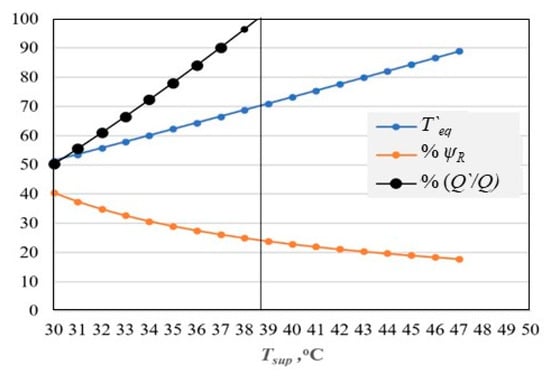 Tref is the reference environment temperature. A fixed value of 283 K in heating and 273 K in cooling were selected as common bases for all analyses. Then, the exergy-based (Equation (2)) sensitivity for maximum rationality at a given supply temperature is proportional to the uncertainties in the supply temperature, and it is twice as much. Therefore, for a narrow margin of sensitivity required about the maximum ψR at low supply temperatures as desired by the EU roadmaps, uncertainties in the supply temperature must be minimal. This is a critical issue for control systems of 5DE districts with renewables in terms of exergy because Tsup is low, and ΔT`eq must also be kept minimum, making the condition hard to satisfy. Figure 3 shows the trend of variables according to different Tsup values. Maximum possible exergy rationality, ψR, which is 0.40 is obtained at Tsup = 30 °C. At this supply temperature, the insulation must be too heavy that the Q` will be about 50% of the design heating load, which is not practical. If Tsup is 35 °C (308 K) and the reference temperature is 283 K, then T`eq is 335 K (62 °C) for maximum ψR at these temperatures. If Ta = 24 °C (297 K), ψR will be: