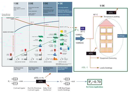 Figure 4 shows the progress of district energy systems, starting from very early local district heating systems based on fossil fuels, mostly coal and lignite. At this 1DE (1G) steam age, the thermal efficiency was low, supply temperatures were high, and the exergy rationality was as low as 0.08. This small number means only 8% of the useful work potential (exergy) of coal could be utilized. The remaining potential application opportunities were irreversibly destroyed according to the 2nd Law of Thermodynamics. This destruction, in turn, translated to additional CO2 emissions in addition to direct emissions from the plant stacks. The supply temperatures were high, and steam heating was popular. The only advantage was the minimization of pumping demand in the district while steam was conveyed. In-situ age (2DE) expanded the district size and introduced the combined heat and power concept at supply temperatures close to 100 °C. This generation transformed from steam to hot water. Solar energy, geothermal energy, and biomass were introduced in 3DE. Metered and monitored supply heat at a temperature below 100 °C were carried through pre-insulated pipes.