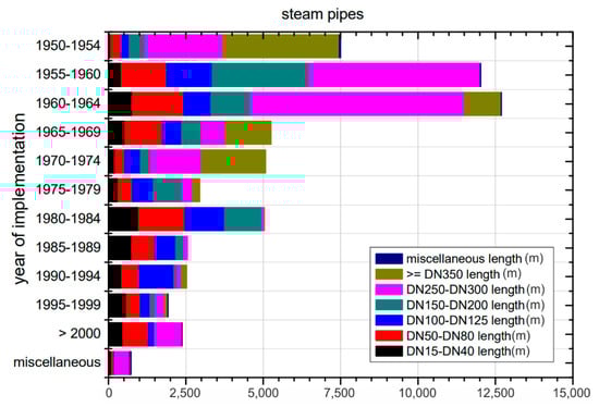 Length of Steam Pipes of Different Diameters in District Energy Systems Over the Years. From []. This figure shows that district loop lengths (in meters) composed of steam pipes have been significantly reduced since the 1950–1954 period. First, this results from the transition from steam to hot water, and second the recognition of the fact that pumping power demand-related emissions versus embodied emissions of large pipe diameters have an optimum point, which generally calls for shorter distances and moderately-sized pipe diameters. That is why larger pipes like DN350 pipes are not used anymore.