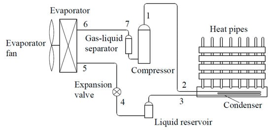 Heat Pump/Heat Pipe Composite System. From [,]. In this system, the heat-pipe radiator acts as a condenser for the heat pump while heats the indoor space at low temperature through the heat pipes.