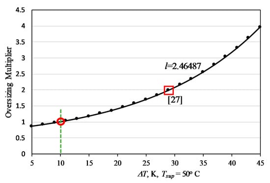 Figure 7 shows that the oversizing requirement becomes excessive by choosing ΔT above 30 °C, contrary to what was proposed in a research thesis [].