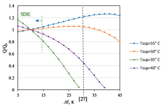 Figure 8 shows the 5DE curve (Green line), which corresponds to the target of Tsup = 35 °C, such that at this supply temperature, about 18% more heat at ΔT of 5 K may be generated (Q/Qo = 1.18). The practical range is 15 K and below. About 10 K is the common point for all supply temperatures for Q/Qo = 1 base (See Figure 7). Below 10 K, this ratio particularly increases above one for 5DE systems. Therefore 10 K is the lower bound. In the same token, the upper bound is 15 K if the Q/Qo is permitted only down to 80%.