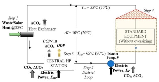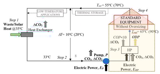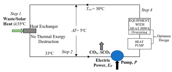 Today`s strategies have started to involve low-temperature waste heat resources and renewable energy resources in low-temperature district energy systems along with solar prosumers in an optimum resource blending. Following this trend, the third and fourth-generation district systems have started to involve much lower temperatures to utilize the waste heat and low-enthalpy geothermal energy, which is also abundant. However, the conventional heating systems were only able to cope with lower temperatures down to about 60 °C. Below this supply temperature, the district system requires new equipment technologies and better ways of harnessing on-site solar energy to supply heat to new equipment. Another option is to use heat pumps to peak the supply temperatures to either eliminate or minimize the oversizing of standard heating equipment or reducing the need for new technologies in the short term. However, current heat pump technology has unique challenges regarding the exergy mismatch between its electrical power demand and the peaking thermal exergy (Inset in Figure 4).