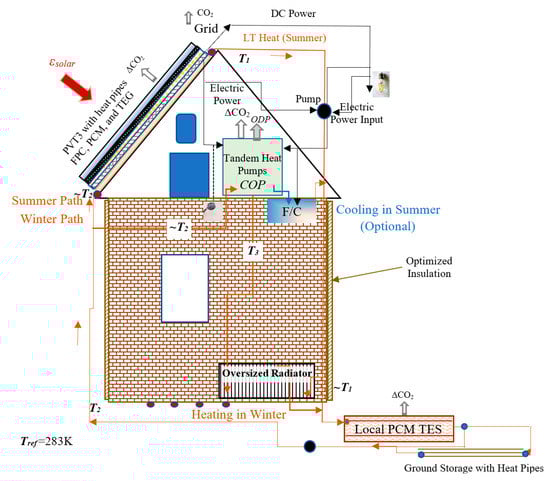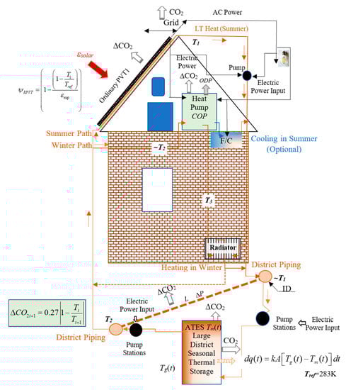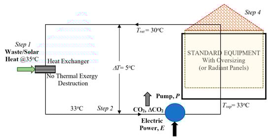 Someone, somewhere, sometime, and by some means, will need to offset the exergy destructions with additional fuel spending and effort. In other words, we ‘calculate’ the direct emissions but ignore the additional emissions responsibilities, which take place due to mismatches of useful work potential (Exergy Destruction) between the supply and demand. Recognition of the relationships among energy, exergy, exergy destructions, and nearly-avoidable CO2 emissions is critical in emissions control for taking a sustainable position against climate emergencies []. Some concerned scientists and engineers have first announced the importance of exergy in the EU by releasing an opinion paper in 2016, with a ‘Think Exergy, not Energy’ []. They explained the concept of exergy and its application to energy efficiency, reaching out to policymakers to call for the formation of an International Exergy Panel to specifically address exergy destructions and their implications on the environment. Although this panel did not materialize, it generated enough interest for partial recognition of the importance of the 2nd Law of Thermodynamics. The EU is preparing new roadmaps to mobilize low-exergy (temperature) resources like waste heat, low-temperature solar heat, and low-enthalpy geothermal energy resources. These are widely available but untapped so far. Among various opportunities, buildings, representing almost 40% of the global energy consumption and a similar rate of CO2 emissions, present the largest asset of decarbonization efforts by utilizing such low-exergy sources on the horizon.