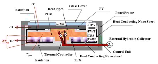 - Kilkis, B. Development of a Composite PVT Panel with PCM Embodiment, TEG Modules, Flat-Plate Solar Collector, and Thermally Pulsing Heat Pipes. Sol. Energy 2020, 200, 89–107. [Google Scholar] [CrossRef]