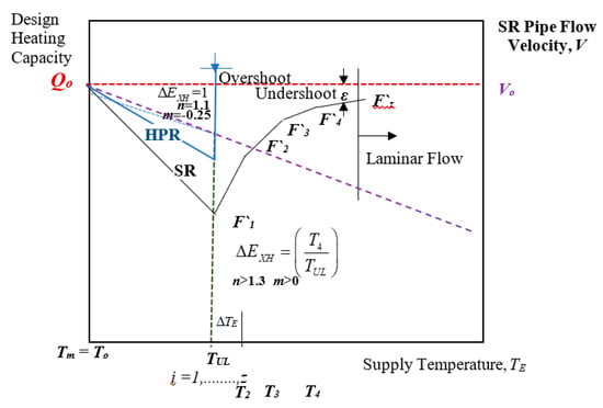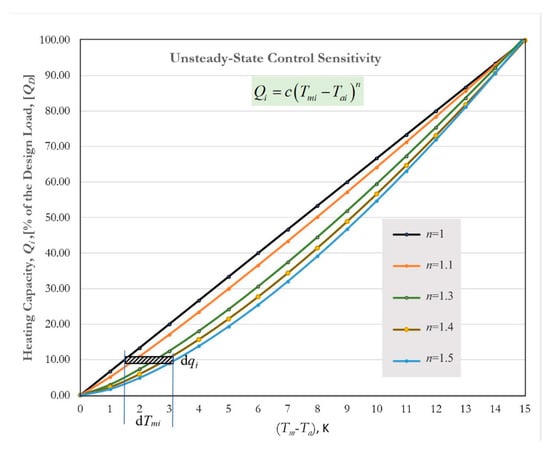 The over-insulation rate is implicitly given by Equation (3). (n) is the equipment heating capacity exponent []. Tsup0 is the original supply design temperature of the heating equipment, like 70 °C.