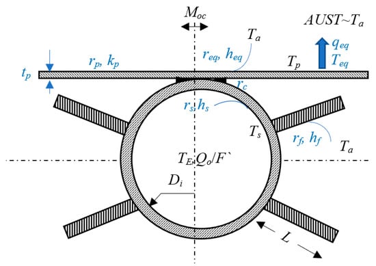 In many EU countries, half of the residential stock comprises buildings, which were built before 1970, when the first thermal efficiency regulations were not in place yet []. This situation is almost the same for all other countries with exceptions like Spain and Ireland. Since such existing buildings are still energy-inefficient despite thermal over-insulation retrofits, their thermal loads are still high. They run on old heating equipment like steel or even cast-iron radiators or natural-convection coils, which were designed for high supply temperatures. Therefore, there is a significant conflict between the many old buildings that demand high supply temperatures and the new EU roadmap of utilizing low-temperature thermal sources. Old hydronic heating equipment was designed for at least 70 °C of supply design temperature (Teq). Nowadays, the EU is considering moving towards ultra-low temperature district energy systems with temperatures as low as 35 °C (Tsup) [,]. In the Framework of International Energy Agency (IEA) Annex 37, a comprehensive compilation of research was carried out by IEA on low-temperature heating and its potential implications and the so-called side effects []. They argued that adding passive building systems for better retaining of solar gains and other internal sources, a continuous but lower thermostat settings shave off the peak loads and somehow enhance the utilization of low-temperature heat supplies. They considered floor heating, wall heating, oversized radiators and convectors, and air heating. Their studies were not too conclusive about energy performance, which were limited to the 1st Law of Thermodynamics only, and they did not investigate the effect of district piping and pumping on energy benefits or disadvantages. The potential impacts of low-temperature heating from the perspective of buildings about indoor air quality (IAQ), comfort, and energy have been further investigated by Eijdems, Boerstra, and Veld, without considering the conflict between energy supply temperature and the equipment demand temperature []. For public understanding and acceptance, they termed the low-exergy (Low-Temperature) energy as ‘low valued’ energy. They overviewed the impact of low-temperature supply to heating equipment for several types of equipment, including radiant floor and wall panels, low-temperature air heating. They qualitatively claimed that IAQ and sensation of comfort improve mainly by using radiant panels, which already permit low temperatures for operation. However, they did not study how low-temperature heating may be made possible by designing new equipment and or existing oversizing equipment, except noting that heat pump COP values may increase due to reduced temperature deficit between the supply and demand []. Figure 2 models this conflict of at least 35 °C of temperature deficit. When a low-temperature source is provided at Tsup, Figure 2 also shows that over insulation of the old buildings may reduce the gap.
