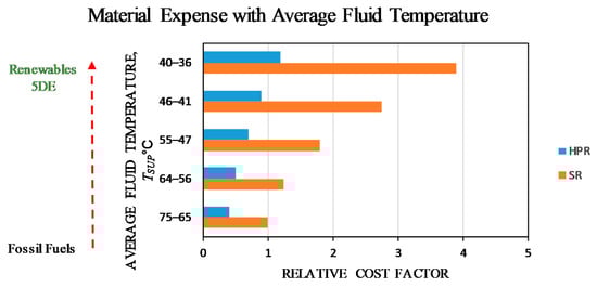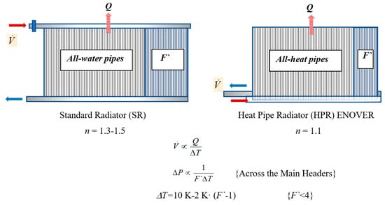 Here, the number 1.33 is the exponent of the heating capacity equation of a standard radiator. Here, ΔT is referenced to 10 K. Figure 8 shows that at relatively low supply temperatures, oversizing has diminishing returns in terms of increased ΔT values above 30 K. For lower supply temperatures such as 35 °C, as targeted by the EU goals of ultra-low district heating, namely 5DE, ΔT must be around 10 K, in some cases, as low as 5 K to have some positive heating capacity gain by series oversizing. Otherwise, irrespective of the degree of oversizing, the heating capacity of the original equipment cannot be restored. Such small ΔT values, of course, strain the piping and pumping costs and material embodiments besides related CO2 embodiments and operating emissions. Another solution, which seems to be already available, is to use radiant panels, which may be made readily compatible with 5DE systems. However, these systems carry the same problems of the additional expense of more tubing (less tube spacing on centers) and ancillaries according to their material, energy, and CO2 embodiments and pumping demand, plus their difficulty to retrofit existing buildings. All these challenges call for new heat pipe technologies in space heating and cooling at low-exergy systems.