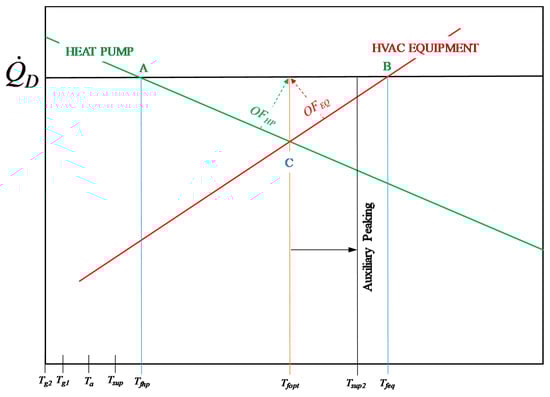 As discussed in later sections of this paper, electrically operated heat pumps are not necessarily exergy-rational. Instead, an optimum mix of equipment oversizing to retain their rated capacities at low temperatures with or without heat pumps is necessary (See Section 2).