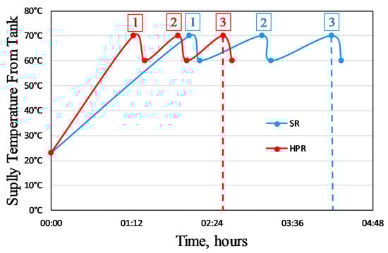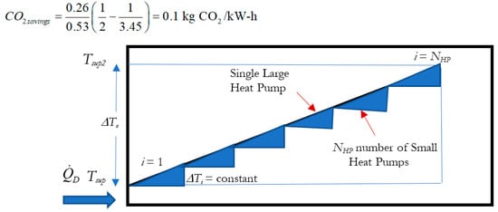 If a heat pump is installed between the solar PV system and the indoor electric heater with a given COP, ψR will be raised only by a factor of COP. To be even with the unit exergies of the input (solar electricity) and the output (heat) in the above calculation, the necessary COP value (1/0.006) is impossible when compared with the theoretical Carnot-Cycle limit for heat pumps, even if a case of infinitely cascaded heat pumps in parallel is considered []. The theoretical ideal limit is the ratio of Tpeak/(Tpeak − Tsup). For example, if a heat pump peaks the low-temperature thermal supply (Source Temperature) at 308 K to 350 K (Peaked Temperature), the theoretical limit for COP is 8.3. Instead, series cascading of smaller heat pumps may keep increasing the peaking temperature. For example, two smaller heat pumps in series stepping up the temperature towards the final peaking temperature in two equal steps (42 K/2 = 21 K, each) relax the ideal COP limits. The first heat pump has a theoretical COP limit of (308 + 21)/21 = 15.66. The second heat pump has a theoretical COP limit of 350/21 = 16.66.