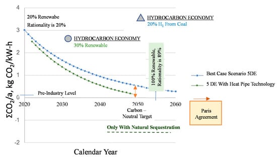 The total unit emissions rate of 1.217 kg CO2/kW-h is the sum of Equations (7) and (8). Therefore, district heating systems transitioned away from the steam age, namely from 2G (2DE) systems to temperatures below 100 °C to reduce the exergy destructions. This example shows that the yet untold, unseen, and unexplained nearly avoidable emissions ΔCO2 is about 55% of the direct CO2 emissions. This means that we see the complete problem but know only half of the solutions, which can only be revealed by exergy rationality.