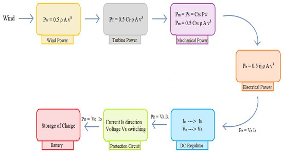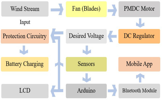 A sequential model of the system design is shown in Figure 2 given below. The basic step is the extraction of wind using fan blades, connected with the Permanent Magnet DC (PMDC) motor which generates electricity upon the rotation of its shaft primarily caused by the collision of wind. The motor is connected with a DC regulator which provides a regulated DC output to the battery. This output is measured using the voltage sensor [29] and the current sensor connected with Arduino. There is an LCD screen connected with the Arduino to display the electrical parameters of the regulated output. Then, the next phase is the protection circuitry which has two functions. One is the switching of electric power using a relay module [30] being controlled by Arduino and the decision taken upon the basis of the percentage of the charge ratio of the battery. The other function of protection circuitry is to stop the flow of current from the battery towards the motor by using a power diode [31]. After this, the electrical power is provided to the battery being charged. There is a Bluetooth module connected with Arduino to display the electrical parameters (voltage and current) on the mobile application.