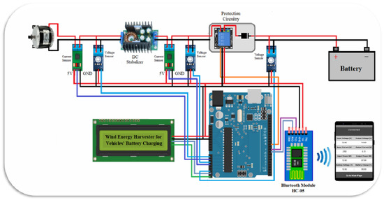 The architecture of the proposed model is demonstrated in Figure 3. The first part of the system is a fan which is being used to convert the energy of the wind into the kinetic energy of the blades. This fan is connected with the shaft of the PMDC motor which, in turn, will rotate it. The DC motor will act as a generator which will generate electricity upon the rotation of its shaft. This generated electricity will be measured by using voltage and current sensors [32] in parallel and series, respectively. The output of the DC motor will be fed to the DC regulator which regulates the generated output voltage. The output of the DC regulator is again measured using voltage and current sensors so as to calculate the voltage and current, respectively, and thus power. In this way, the input and output electrical parameters of the DC regulator are used to measure the efficiency of the regulator. After this, there will be a protection circuitry installed which contains a relay module and a diode. Arduino continuously measures the voltage across the battery to calculate the percentage up to which the battery has been charged. Based upon this calculation, the Arduino will decide whether to switch on the relay. If the voltage across the battery is between the minimum and maximum set voltages, the relay will be switched on—otherwise it will be off. From a VANET perspective [33,34], a mobile app operated via a Bluetooth module was also designed, which enabled us to obtain the results of the electric generation on the app for easy access to the data. Finally, the diode before the battery will allow the current to flow only towards it and will stop the current moving in the other direction.