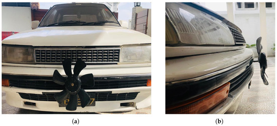 It can be noticed in Figure 5a that the fan was mounted on the front of the car. Only the fan was out of the car’s body, as the air needs to strike the fan to rotate it and no other component, so it is necessary for the fan to be mounted outside the car body. Contrarily, the Permanent Magnet DC (PMDC) Motor was placed inside the car body as there should neither be any type of weight with a fan outside the car nor any drag force due to the placement of the motor. The output of the DC motor was connected to the rest of the circuit using DC wires, suitable for carrying the current through it from inside the car engine. Another view of the fan, mounted outside the car, can be seen in Figure 5b.