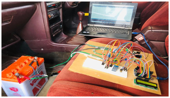 After the generation of electricity from the wind turbine, the output was supplied to the battery once it was stabilized, measured, and the protection was assured. The DC wires will take this electricity towards the rest of the system, which was placed inside the car. In Figure 6, it is shown that the input is provided to the system for regulation, measurements, and protection work. After this, the output is supplied to the battery so it can be charged: