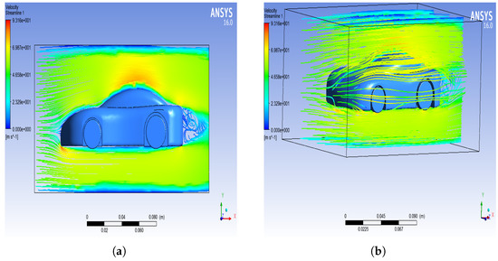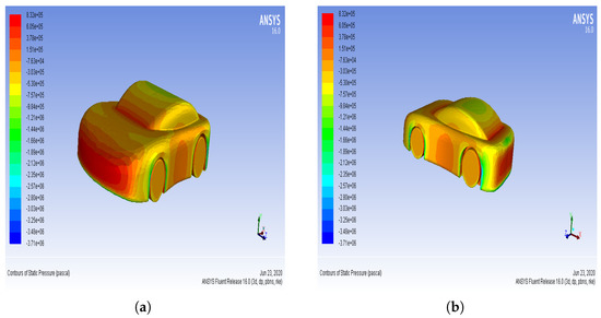 The following simulations used contours graphical method which measures the surface area using different iterations, with which complete structural analysis was performed to identify the effect of the air velocity on the vehicle. In Figure 9a, the front as well as sides are easily visible and indicate that the front of the EV directly confronts the maximum air as compared to the other parts of the body, whilst the sides are the second most pressure-tolerant region of the car. Simply, this analysis was performed in function of the shape of the car, and shows the parts of the car on which more pressure will be exerted by the wind when the car will be driven. It can be seen that when a car is driven, then due to its direct contact with the wind, there is maximum pressure being exerted. Moreover, the wind screen and other parts also receive a considerable amount of pressure. Another view of the same analysis can be seen in Figure 9b, where it is clear that the parts of the car which are vertical in shape receive more pressure from the wind, etc.