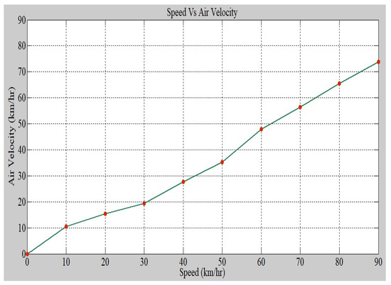 At first, calculations were made on a practical basis to help clarify the difference between the vehicle’s velocity and the air velocity on it. This was so that we could clarify the fact that at the designated location, the air velocity was ample enough to run the wind generator’s fan blades. The relation between them can be seen in Figure 11, which confirms that the air velocity was slightly less to allow the car to run but had enough kinetic energy to be provided to the generator to generate momentum for the fan blades.
