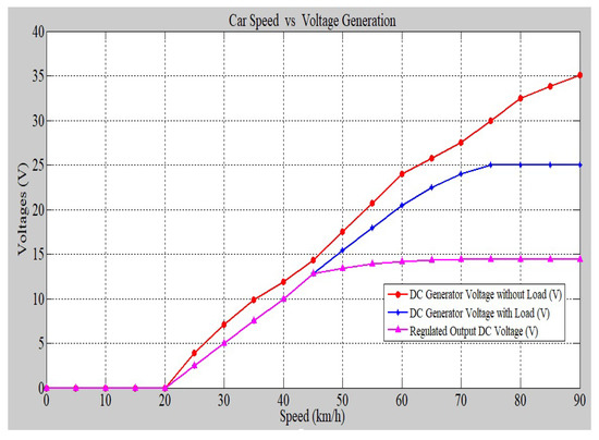 The following graph in Figure 12 was obtained as a result of a comparison between the car speed and the voltages induced in the DC generator with and without load (car battery). It can be observed that the voltage increases with the increase in the car’s velocity. Without load, we obtained voltages as high as 35 V at 90 km/h, but in the presence of a load, this obtained voltage decreased to approximately 25 V at the same velocity of 90 km/h. The regulated line in the given graph indicates the voltages obtained after they passed through a DC regulator to stabilize them at a constant charging voltage, which was 14.6 V for the lead acid battery—this voltage is achieved at the speed of 45 km/h.