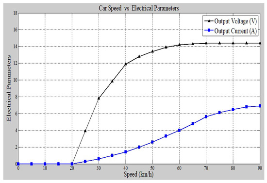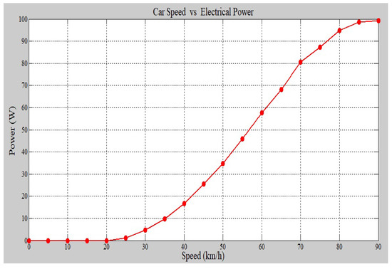 On the basis of the data gathered, it can be observed that at 90 km/h, the generation system has a stable voltage of 14.6 V with a charging rate of 6.9 Ah. The curves indicate that with the increase in the velocity of the car, the voltage and current are also gradually increased, except for the voltage which needs to stabilize after the required charging potential is achieved, as shown in Figure 13. At the speed of 90 km/h, the total power output obtained is approximately 100 W, as shown in Figure 14. Here, it can be noted that the charging rate can be increased with some adjustments, but it will jeopardize the life span of the battery.