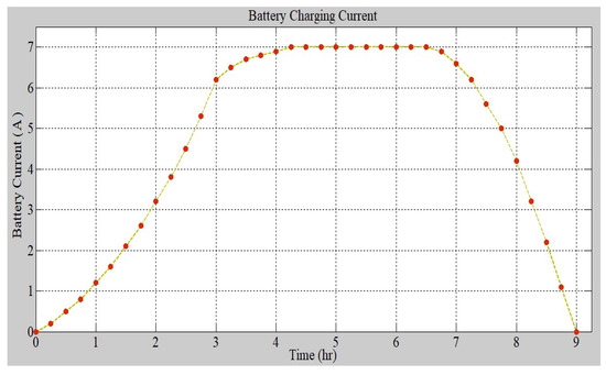 The battery charging trend is presented with time in Figure 15. The chart shows the charging rate of the battery from 9 V (dead battery) up to the 13.1 V (fully charged) charging state of the battery. This is because of the battery resistance which varies. Thus, by this curve, it is to be estimated that when the battery is in a low charge condition, it has high resistance; and with the passage of time, as the battery starts charging and ionizing its charges, then the current increases with the decrease in the resistance. At one point, the maximum current drawn limit of the battery is achieved, and then the resistance of the battery increases again when it is becomes closer to the fully charged state.