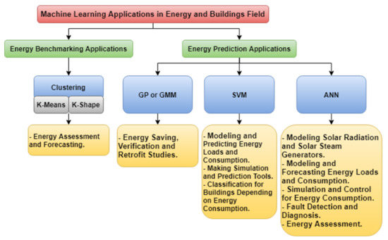 In general, determining which machine learning algorithm is the best is difficult. As a result, it is critical to thoroughly examine the type of accessible or gathered data as well as the application to select the most appropriate model. The ML algorithm selection step depends on many factors such as (1) application-type factors and (2) data factors. In this section, applications of four ML algorithms (i.e., ANN, SVM, GPR or GMM, and Clustering K-Means or K-Shape) are explained to represent advantages, drawbacks, and potential improvements for each algorithm to help ML users in the selection process for the most appropriate algorithm during implementation in the field. After reviewing ML applications, the ML users in the energy and buildings field can deduce that (1) ANNs are a strong tool for modeling and reliable prediction of building energy. They do, however, need a careful selection of network topology and fine tweaking of their many hyper-parameters for training. Because ANN suffers from a local minimum issue, the models’ performance cannot be guaranteed. In addition, to obtain acceptable accuracy, ANN needs to be fed with a sufficient number of samples. Simple MLR models may be able to outperform them otherwise. As a result, ANN is best suited to engineers who are well-versed in deep learning and statistical modeling. We can also deduce that (2) SVM has been found to outperform ANN in load forecasting and can construct models from small data and (3) GPR is utilized for model training with uncertainty assessments among ML approaches and other black-box methods. Uncertainty and sensitivity analysis for various machine learning models have recently been presented and used. As a result, it is worthwhile to devote research resources to deploying these techniques for modeling construction under unclear data. Finally, we find that (4) in multi-dimensional energy assessment systems, k-means and k-shape are both highly efficient, with k-shape being used with time serious data and k-means being used with other data types. The popular applications of ML algorithms around the world in the field are explained in the following subsections and summarized in Figure 1.